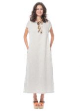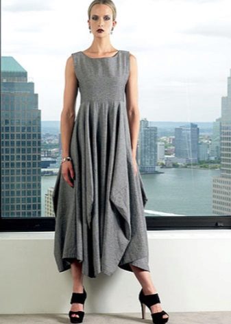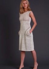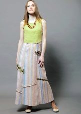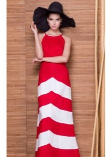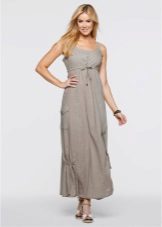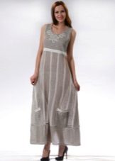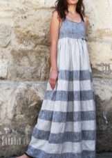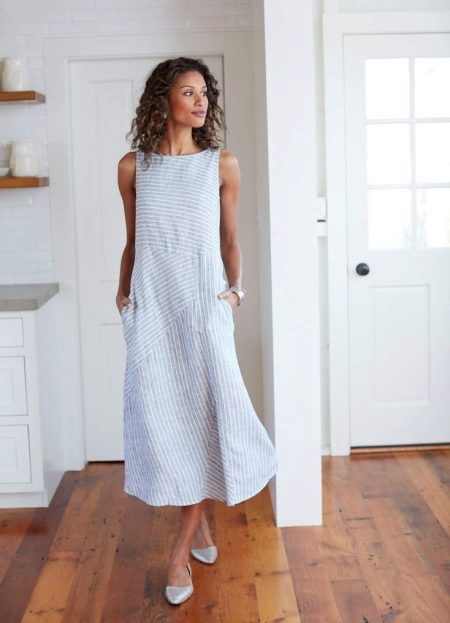 An interesting image will create a linen sundress of light gray color in a white strip. The effect of unusualness is given by the cut of the sundress at the waist and on the hem, where the strip changes direction due to the turned wedges. The hem from the line of the hips extends downward, which creates a slightly flying silhouette. The neckline “boat” gives harmony to the neck. Pockets add practicality. To such a sundress very boats go in color - gray, white. Of the accessories, it is worthwhile to focus on thin wrists, decorating them with a voluminous bracelet of a gray shade.