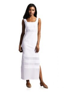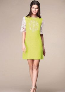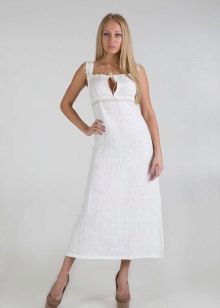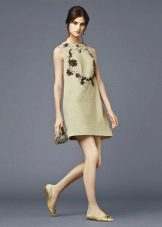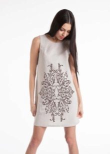 A straight white sundress made of linen above the knee length will look unusual and modern if decorated with embroidery from beads and sequins of bright color. The V-neckline gives sensuality and visually lengthens the image. The wide straps of the sundress emphasize the line of the shoulders and arms and add to the image of fragility. In such a sundress, it is appropriate to go to a party, a social event, complementing with heeled sandals.