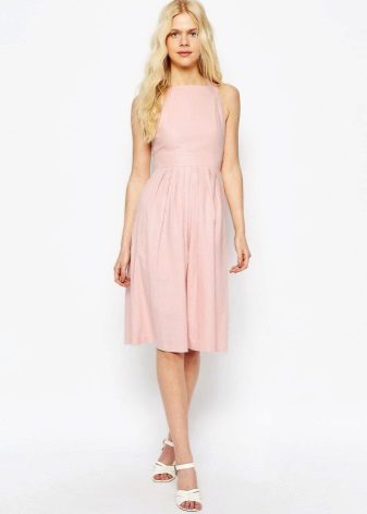 The length of the linen sundress is not limited by the imagination of stylists and the preferences of fashionistas. The traditional knee-length is a sundress with a straight cut, above the knees of minimalist models, and the maxi length is a sundress in the floor.
