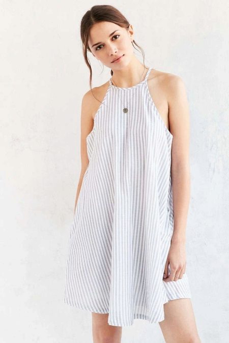 A very feminine and airy image from a linen sundress of a light shade in a gray strip will suit girls free and romantic. The vertical strip visually lengthens the growth, makes the figure slimmer and thinner. The round "T-shirt" neckline sundress, turning into thin straps on the back gives fragility and elegance. The free A-silhouette of the sundress and the length above the knees contribute to enhance the effect of lightness and youth of the model. Such a combination requires a minimum of accessories - a small pendant on a thin chain, a pair of thin rings on the fingers. The hairstyle will fit a smooth or bun gathered upstairs.