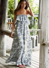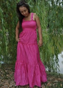 The multilayer elastic band decorating the bodice of the model will help keep the sundress in its place and prevent it from slipping. Typically, these sundresses are sewn from light, airy materials: chiffon or silk. For everyday use, cotton, linen, chintz or denim can be used.