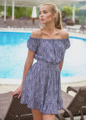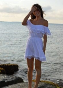 A beach sundress is a type of long summer dress made with bare shoulders and arms. The sundress is held by a wide squeezed elastic in the bodice or at the waist. The neckline can be further emphasized by a wide, magnificent flounce.