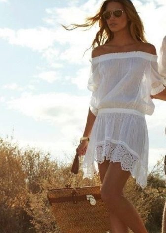 Smart beach option: a snow-white sundress with bright elastic on the bodice and plain motley embroidery on the hem. It can be worn directly on the bathing suit. Bright sunny colors give a special appeal along with it.
