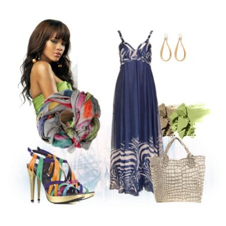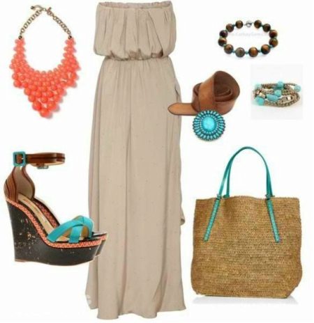 An excellent model, from which it just blows in the summer and on vacation. The modest length is compensated by bright colors, and open shoulders and a neckline zone balance closed legs. A large pendant and bracelets with shells and turquoise stones perfectly complement the outfit.