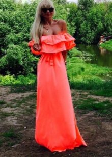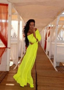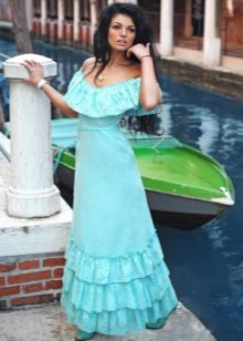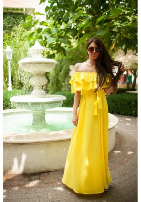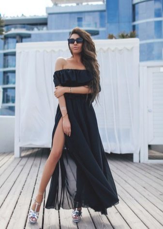 A floor-length sundress will emphasize your femininity and elegance. Of particular interest are models with elastic at the waist and decorated with a flounce along the shoulder line.