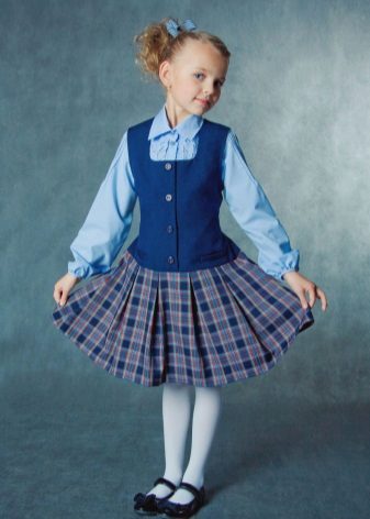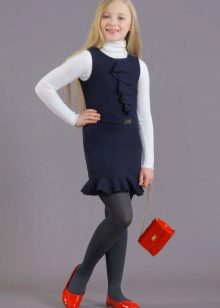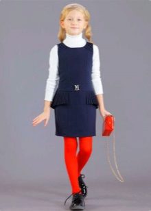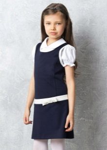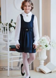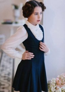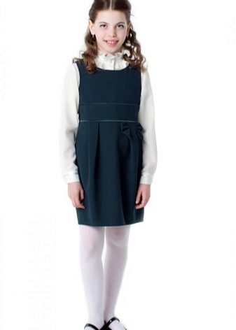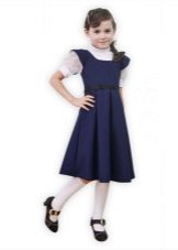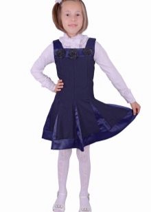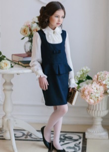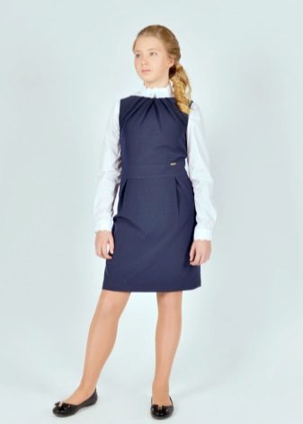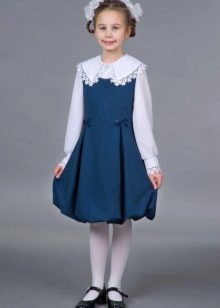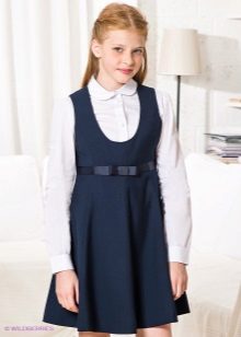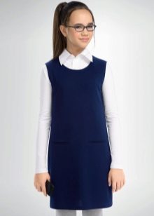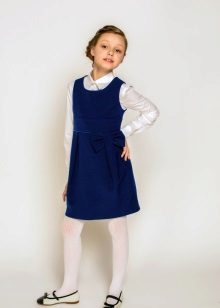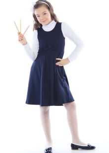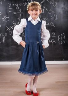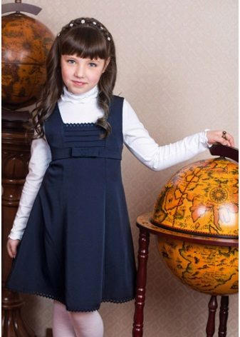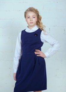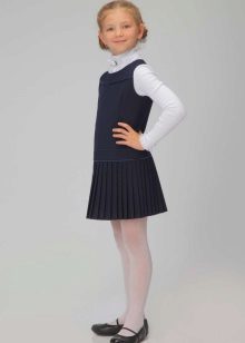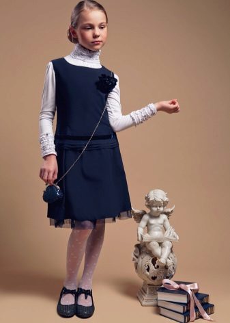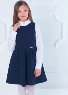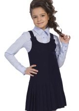 Blue sundress is ideal for a schoolgirl of any age. This is the option that will become the basis of the wardrobe: it is enough to change a shirt or blouse daily to look fresh. A sundress can be worn with a turtleneck, a thin sweater or a top, a jacket, a blazer or a cardigan with a zipper or buttons can be thrown on top. The blue sundress is equally successfully combined both with a light, white or beige top, and with a bright one.