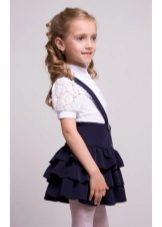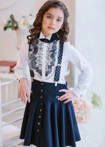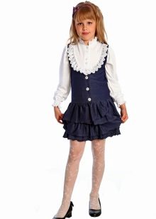 A high-waist straight-cut school sundress model is also popular every school season. This style will decorate a slender child. Girls with figure flaws will look good in high-waisted models, but with a trapeze skirt. Models of a fitted silhouette with a decor in the form of flounces look funny and romantic, sundresses with a pleated skirt also look great on schoolgirls.