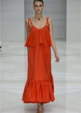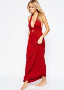- A long red sundress with a smell can become the basis of an everyday or evening look. In the afternoon, wear it with flat sandals, complementing the look with sunglasses and a white bulk bag. In the evening, put on platform sandals and replace the bag with a small clutch.