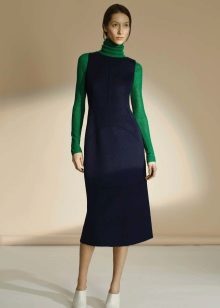 For work at office dense knitted sundresses which are easy to combine with other clothes are suitable. Pay attention to the models of strict silhouette, sundresses with a pencil skirt or a-line skirt look great.The length of the sundress should end at the knee, be slightly higher or slightly lower than it.
