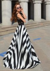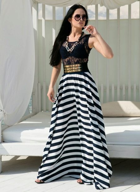 A very original floor-length model that can be worn during a summer vacation in an expensive resort. The color scheme is a classic combination of black and white. A wide horizontal striped sundress skirt contrasts with a seductive lace bodice. A wide belt with metal gold accents emphasizes the waist and is in harmony with large metal beads. Black flat sandals, sunglasses and long flowing brunette hair make the look complete.