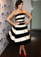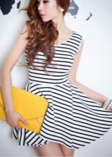 Black and white striped sundress can be supplemented with bright color accessories: red or yellow lacquer strap, shoes, clutch bag, massive jewelry. This is a great solution for a fashion party or disco.
