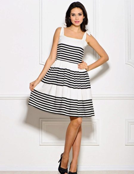 An interesting sundress of medium length free cut, which will be quite appropriate for going to work or a business meeting in the summer. A thin black and white strip alternates with snow-white inserts, which looks original. The thing is also decorated with wide straps with ties on the shoulders. Note beautiful open black shoes decorated with sequins that are in harmony with the sundress.