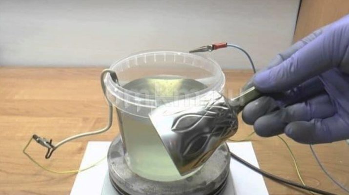 First, each ingredient is separately diluted in boiling water, then the liquids are mixed together and boiled for another hour and a half. After that, graphite is used as an anode, the liquid is cooled to a temperature of +20 degrees and the product is lowered into it. Galvanization will occur within 3 hours depending on the material of manufacture of the product. After this time, it is taken out of the electrolyte and dried. Then they wipe it with a flannel cloth, that's it - the silvering process is considered to be finished on this.