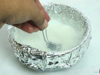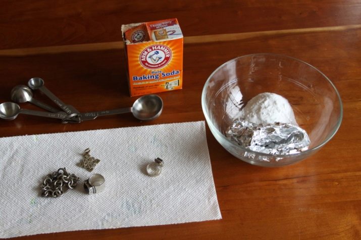 Experienced housewives usually use food foil as an aid. (even a small piece of foil from a chocolate bar will do). Having prepared all the necessary tools and contaminated silver, 1-2 tablespoons of soda are bred in 2 glasses of water. The resulting soda solution is sent to a fire, brought to a boil, and then the darkened products and a fragment of the foil are lowered into it. After 15 minutes, the products will return to their original shine and radiance, they can be removed from the solution and wiped dry.