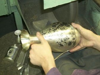 Today, it is easiest to blacken silver mechanically. This will require graphite combined with iron oxide and turpentine. A porridge mass is placed on top of silver items and held on to them until completely dry. Residues are removed from the surface with a soft brush. Further, the protruding places are carefully treated with alcohol, thereby creating an aging effect.
