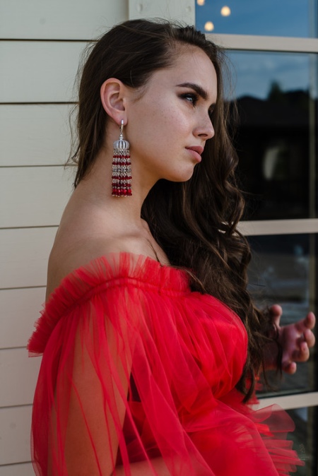 Stylish “chandelier earrings” in ethnic style will perfectly complement the feminine look, which has elements of clothing made of light fabrics. So, an interesting summer option will be silver earrings interspersed with red crystals. They will emphasize the graceful neck of their owner, will go well with clothes of the same shade as the stones.
