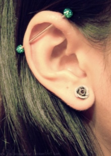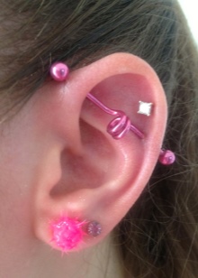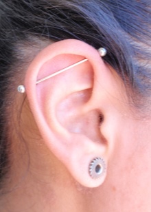 - Another interesting type of ear piercing is Industrial. It has two holes that are connected by one earring. As a rule, a similar puncture is done in the upper part of the ear. Here, rods having a diverse base shape will be appropriate.
