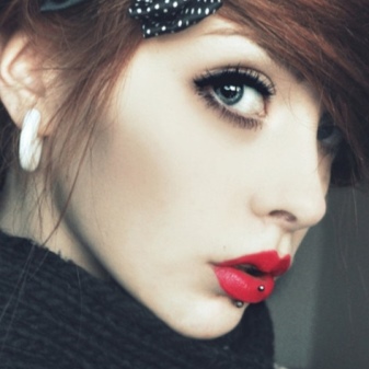 Punctures on the lip, as a rule, are supplemented by labrets.Such accessories meet all safety requirements. The disk in such earrings is securely attached to the base, so you will not swallow it by accident and do not hurt your tongue about it. Often, spirals are used for the lips (another name is twists).