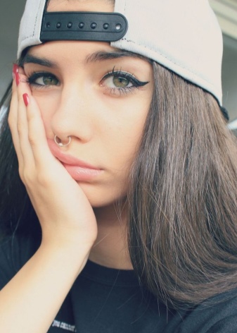 Girls often turn to a nontrivial nose ring. Such an original detail will look harmoniously with a regular black T-shirt, a light baseball cap and skinny jeans. Attractive arrows on the eyes will complement the image.