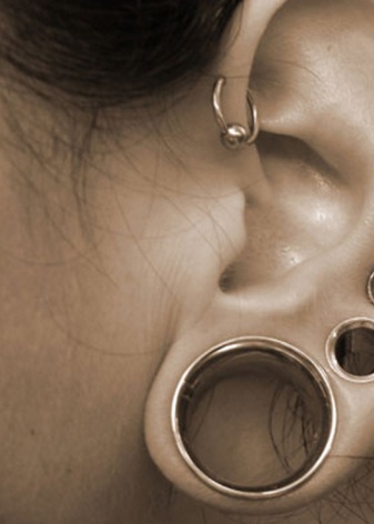 - For piercing in the earlobe, original tunnels can also be used. Special stretchers form large holes that are complemented by various earrings or tunnels.