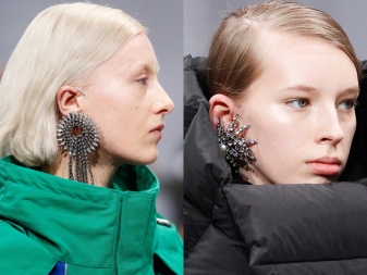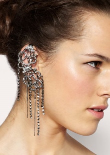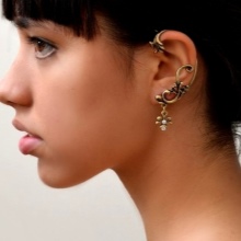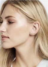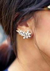 - The most popular earrings that do not imply a puncture in the ear and are attached to it using special cuffs. These cuffs hold on to the outer or middle parts of the ear. They are a reliable device that allows you not to think about the size of the jewelry. Even very massive earrings will hold firmly by means of such clips, provided that you fix them correctly.