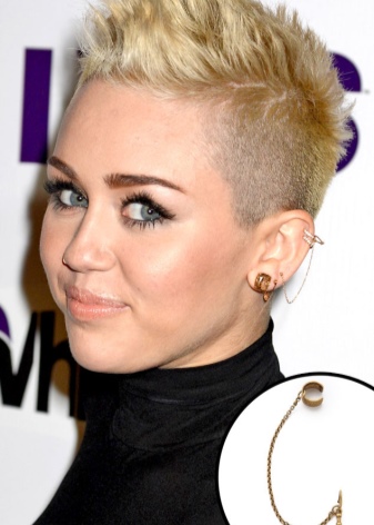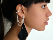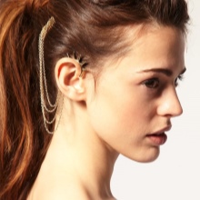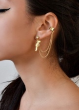 - Another type of such earrings is products for people with pierced ears. And some cuffs have cloves for 2, or even 3 holes. One or more parts of the earring is inserted into the punctures, while the upper part is attached to the outer edges of the ear. All these fragments are interconnected by means of chains, threads or openwork arches. It looks very beautiful. Punctures in the ear will also be needed for those people who are used to walking with headphones. After all, removing them with careless movement, you can accidentally hook the earring and lose it. In cold winters, when you can’t put your nose out into the street without a headdress and a scarf wound around your neck, it is also prudent to wear puncture cuffs.