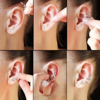 Cuff earrings are usually fastened with a special clip to the ligament or outer curl of the auricle. The fastening metal is very pliable and allows you to fit the jewelry to your ear so tightly that the possibility of losing it is almost zero. However, the mounting mechanism is almost not noticeable, and therefore does not cause any discomfort.