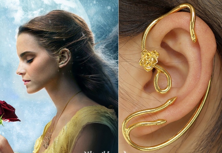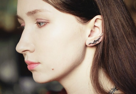 They are especially fashionable today. They can take the form of animals, fish, dragons, just cobwebs. They are worn completely in the ear, sometimes they cover part of the face, or hang up to the shoulders. But there are lovely little things: a small bow or flower in the center of the ear. The thin chain of the original weave looks beautiful, rising from the earlobe to its upper point.