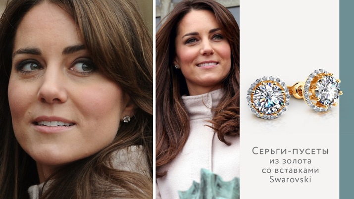 - The Duchess of Cambridge, Kate Middleton, prefers to wear small gold earrings, complemented by the usual Swarovski crystals. They look at her very harmoniously and emphasize the correct facial features.