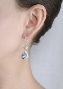 An extravagant option is offered by the Moscow jewelry factory. This is an exclusive model with 750 gold, 12 aquamarines and 330 round diamonds. A more casual version of white gold can be found in the collection “Reflection of Heaven”. beautiful earrings with two aquamarines and six diamonds with an English clasp.