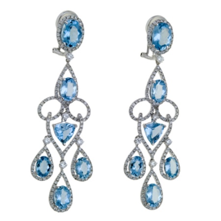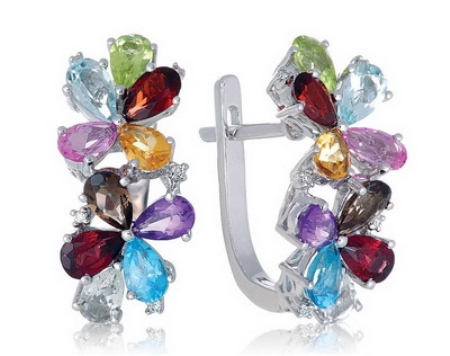 On an alloy of white gold 585, two flowers of five and four petals flaunt. In addition to two aquamarines, they are decorated with 10 diamonds, two sapphires, amethysts, topazes, citrine, garnets, chrysolite and quartz. This model is significantly more expensive than the previous one. But earrings will not only show your status, but also emphasize your taste and beauty.