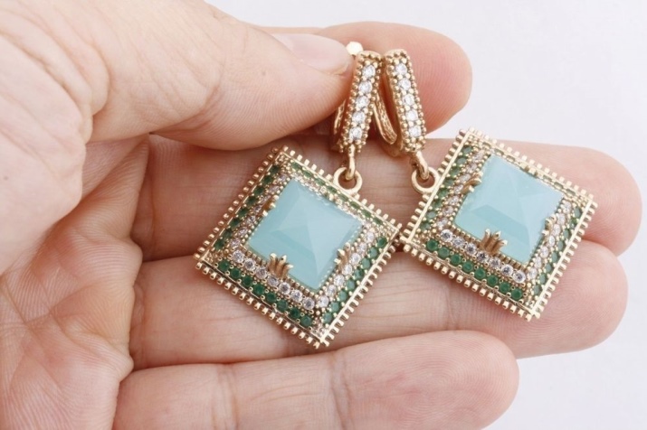 Gold earrings with aquamarines, nanocrystals and cubic zirconias are suitable for this pendant. They are perfect for evening wear. Ideal decoration will be combined with a long dress on the floor. These earrings are suitable for girls with blue and green eyes.