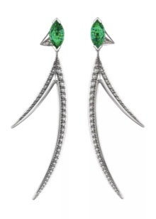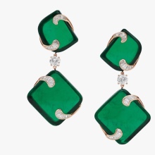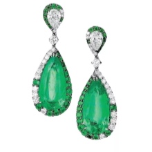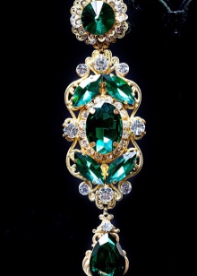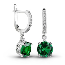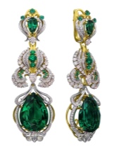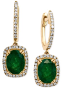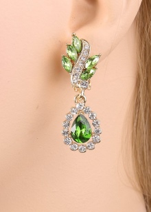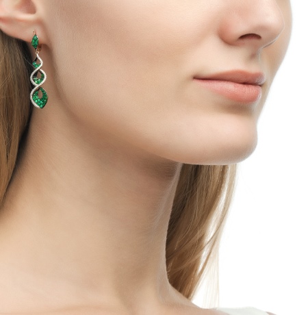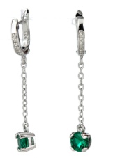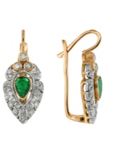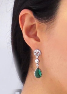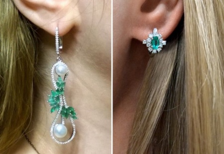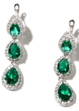 - Long earrings with pendant. Mostly they have a clasp-clove and decorated with two stones. The most fashionable version of such earrings is when the earring is decorated with a round emerald, and the pendant is a drop-shaped emerald.