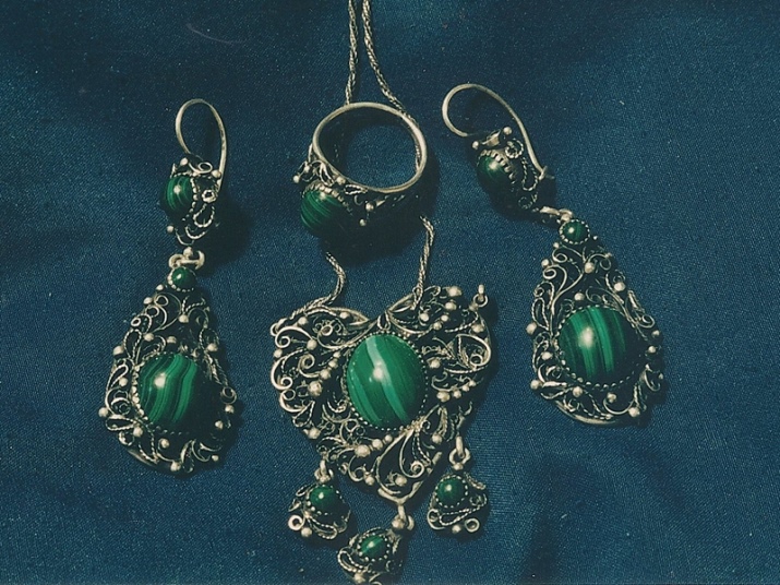 Malachite is an opaque mineral of a dark green color. There are many colors that depend on the texture of the stone. Chrysolite is a translucent golden-green stone with a magnificent luster. Jade, tourmaline and others are also popular.