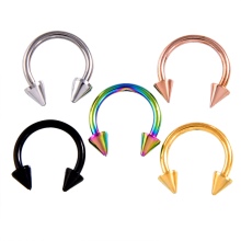 This is an original crescent-shaped horseshoe ring. The ends of this decoration are crowned with spinning balls, spikes, cones.