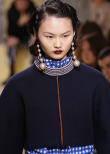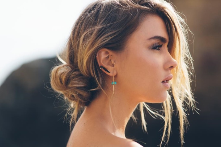 Beautiful earrings will look great with hairstyles that open your earlobes. Owners of the popular bob haircut can choose playful earrings, consisting of a chain and a ball.