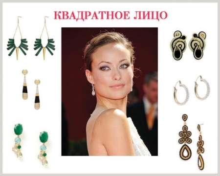 - For owners of a square face, it is recommended to opt for elongated models with rings or with round pendants. The soft curves of the earrings will smooth out the sharpness of the cheekbones and chin. Girls with a square type of face should not wear diamond-shaped earrings-rings, as they only emphasize their visual flaws.