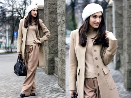 In a classic toilet, you can try the following combination: takes a dark color and a small size of felt or wool, a short cloak of delicate colors and shoes for the classics (or high boots). A similar hat will look good with a classic long coat tied with a strap.
