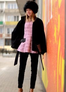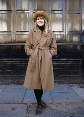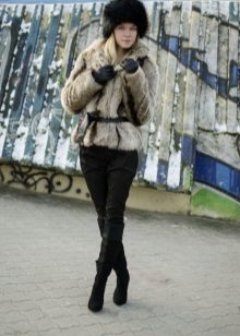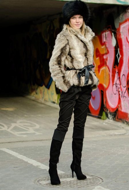 Black fluffy boyar with a neat fur coat with a black leather belt. The beige outerwear dilutes the black bow and is its main accent, because in addition to the cap, black pants and boots are worn.