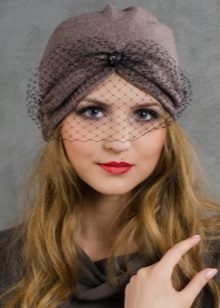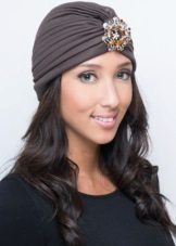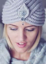 An important role in modern headdress is played by decor, it is especially relevant for an evening look. The classic decoration is a massive brooch, smooth or with a scattering of pebbles. Fashionable turban today is also decorated over the entire surface with sequins or beads. Mysteriousness and piquancy to the lady will add a mesh veil on the headdress - an excellent evening option. However, it should be borne in mind that when choosing a turban with decor, you do not need to wear other catchy decorations, since this is a self-sufficient detail that attracts attention.