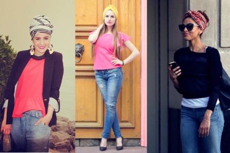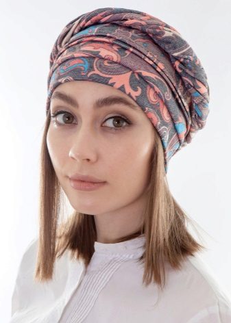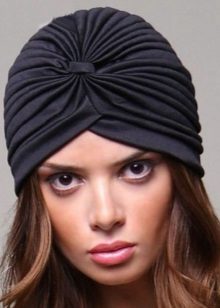 Any woman can make a turban from a cotton or knitted scarf. It is easier to do this from lightweight texture material. It is necessary to cover the head with a scarf, placing its ends at the back. The tips are tied into a knot, twisted separately and fixed in front of the forehead. It remains only to make out a beautiful knot, you can decorate it with a brooch or beads.