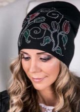 Often black hats are decorated with ribbons, folding them into flower buds or bows. The shade of this decor can be anything - both in the tone of the hat, and absolutely contrasting - white, pink, red or multicolor.Machine embroidery is also popular, which creates a single canvas, a pattern that looks like a continuation of the fabric of which the hat is made. The most popular variant of such embroidery is lettering.