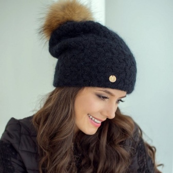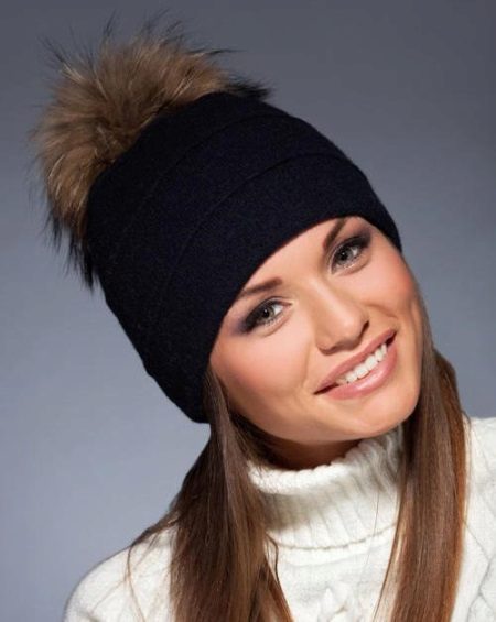 A black hat with a pompom made of natural fur is the trend of the season. This is a classic model that fits any clothes, adorns a woman with any type of appearance and looks stylish and elegant.