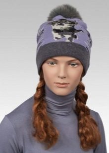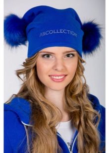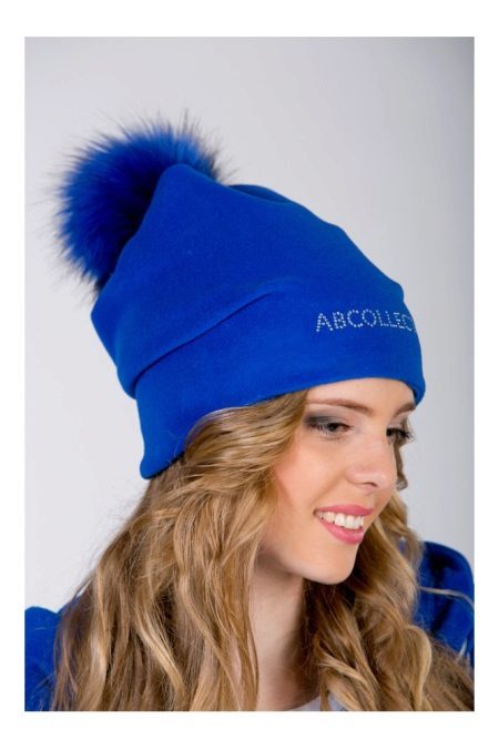 Youth hat-stocking is made in bright blue color, which echoes the color of outerwear. The item adorns a voluminous fur pompom of the same color, due to which the cap takes on a slightly mischievous look. Another element of the decor - an inscription made of silver rhinestones - makes the headpiece even more stylish. The style of the cap looks especially beautiful under the girl’s loose blond curls, and her skin color and makeup are in harmony with the color of the headgear.