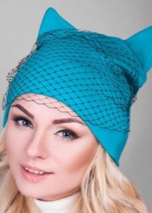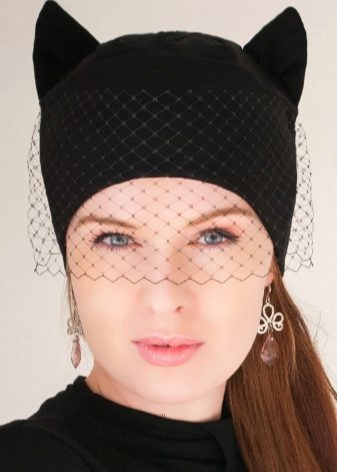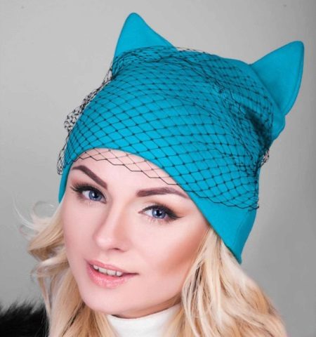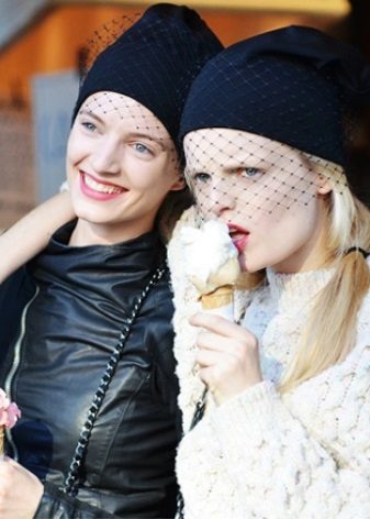 An extravagant and mysterious look will give you a fleece hat with a veil, perfectly matched in color to outerwear.