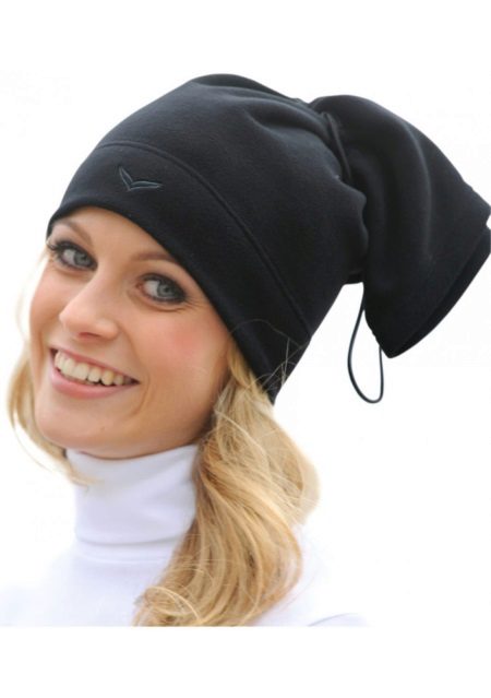 A soft fleece scarf hat is practical and comfortable to wear. This is a transformer model that can be pulled down at the crown with lacing. The cord itself is neatly tucked in or hanging from the back. If desired, such a hat can be turned into a warm scarf that perfectly protects the neck from cold and wind.