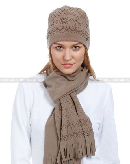 Charming female fleece set - beanie and a long scarf. The headdress is light brown in color, which matches the girl’s color type, is decorated with a cute winter ornament depicting snowflakes and deer. The soft scarf is decorated with fringe, which makes it look more comfortable. This winter set looks harmonious with a loose white pullover.