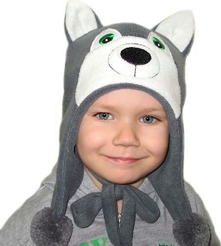 Another fun children's model from fleece is a hat for the boy in the animalistic style, depicting the head of a wolf. The product has a saturated gray shade (the same color as the baby’s eyes) is decorated with white ears of a characteristic wolf shape and a white muzzle with kind green eyes. The cap is tied under the chin, also the thing is decorated at the bottom with small fleece blankets.