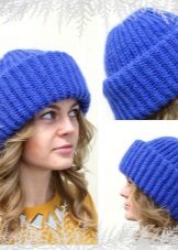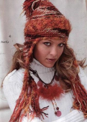 A hat of the usual form with lapels, can be worn with any kind of outerwear: with a fur coat, jacket, coat. One of the advantages is the universal size of the cap - thanks to knitting, the fabric can stretch to the required volume. And of course, the abundance of yarn colors and, accordingly, hats makes it possible to choose a product for any color of clothing.