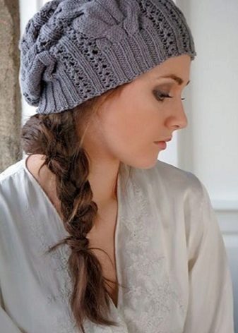 An excellent option for a hat for medium and long hair is a variety of weaving, such as "spikelet", braid, braid, etc. Two pigtails from under the cap will give an image of spontaneity. So that the hair under the headgear does not fluff, you can collect it in a tight bun or tail. It is under such hairstyles that you can safely choose narrow caps that are the enemy of any volumetric styling.